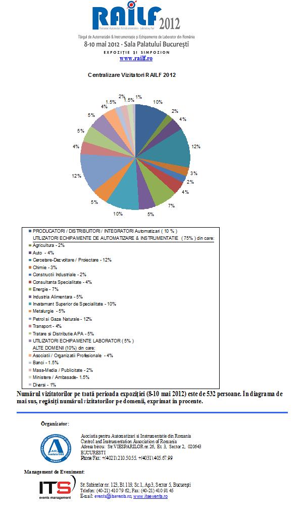 Dupa cum este binecunoscut, Asociatia pentru Automatizari si Instrumentatie din România (A.A.I.R.), a organizat in perioada 8 - 10 mai 2012, cea de-a 2-a editie a evenimentului RAILF "Târgul de Automatizari & Instrumentatie si Echipamente de Laborator din România" - RAILF 2012 (Expozitie si Simpozion), gazduit de Sala Palatului din Bucuresti, fiind cel mai reprezentativ Eveniment din domeniu din România.